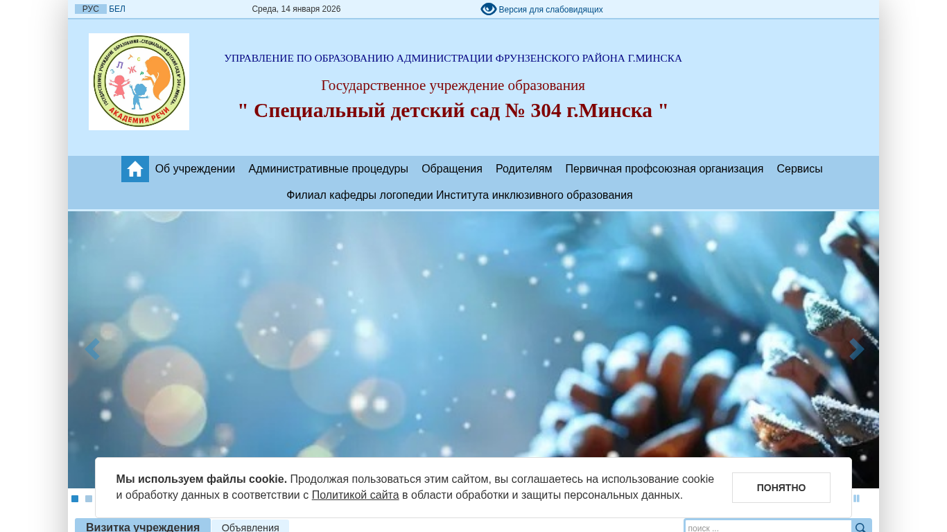 | AI-анализ | The portal is a website of the Special Educational Institution "Special Kindergarten No. 304" in Minsk, Belarus. It provides information about the administration, pedagogical staff, history, and achievements of the kindergarten. The website also includes sections on rules and procedures, child admission, parental involvement, and various educational services. The kindergarten focuses on creating a developmentally rich and correctional-educational environment for children with special needs. The website includes a photo gallery and information on the admission process, policies on handling personal data and disability assistance, and rules for ensuring educational safety. The website also lists job vacancies and administrative procedures, as well as normative legal acts related to the kindergarten. The site is operated by the Minsk City Education Administration and is part of the Belarusian Professional Union of Education and Science Workers. The website is available in both Russian |