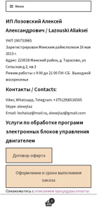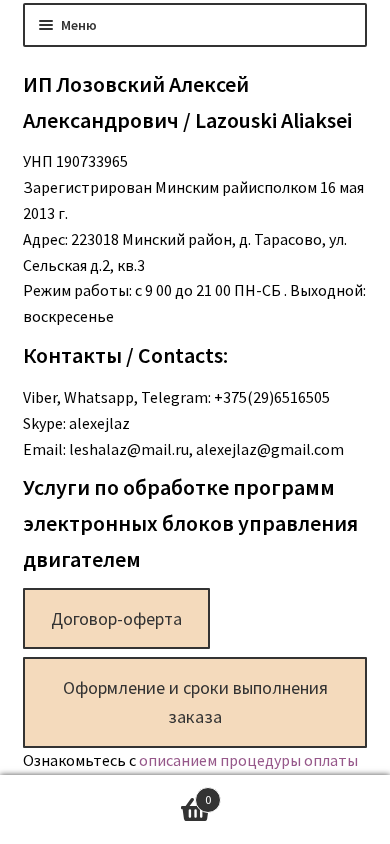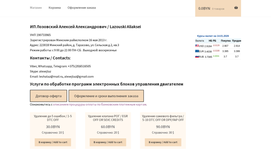 | AI-анализ | The website AlexejLaz.by is an e-commerce platform specializing in automotive services. The title of the website is "AlexejLaz.by" and the description is not provided. The website uses keywords related to shopping, BYN currency, and automotive services such as "cart," "byn," "credits," and "evc." The most frequently used words on the website include "cart," "byn," and various automotive service offerings like "add," "off," and "удаление" (which translates to "deletion" or "removal" in English). The website offers services for the removal of DTC (Diagnostic Trouble Codes) errors, EGR (Exhaust Gas Recirculation) valve, EVC (Electronic Valve Control) system, and AdBlue/SCR (Selective Catalytic Reduction |