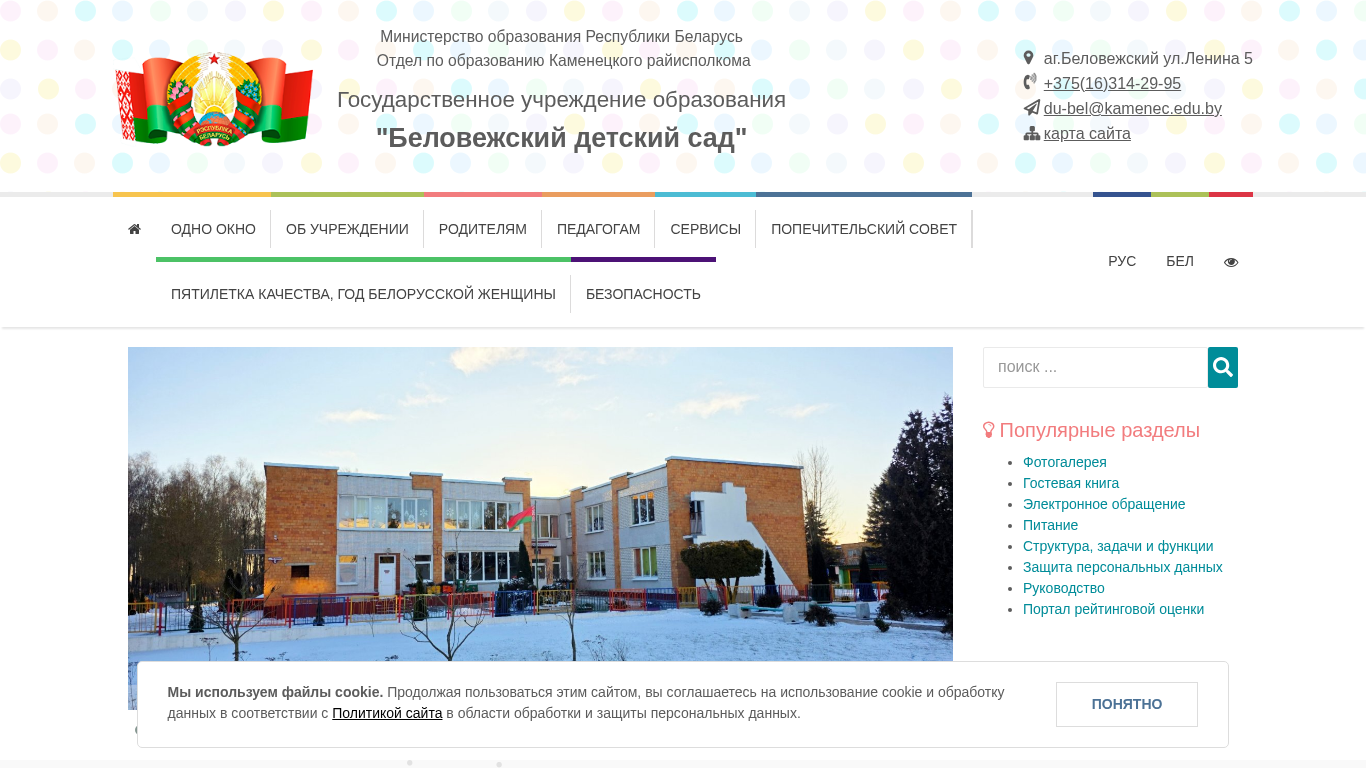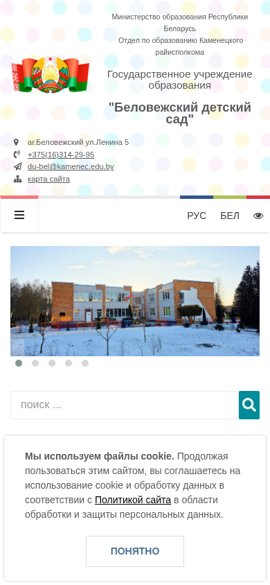 | Адрес | Каменецкого райисполкома, Государственное учреждение образования, "Беловежский детский сад", аг.Беловежский ул. Ленина 5 |