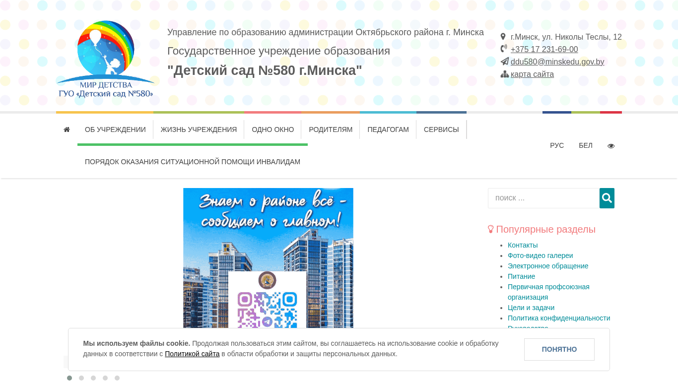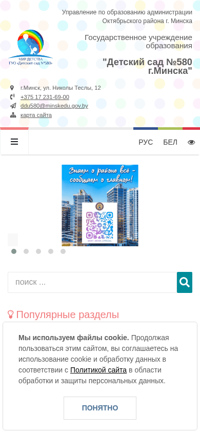 | Адрес | Октябрьского района г. Минска, Государственное учреждение образования, "Детский сад №580 г. Минска", г. Минск, ул. Николы Теслы, 12 |
