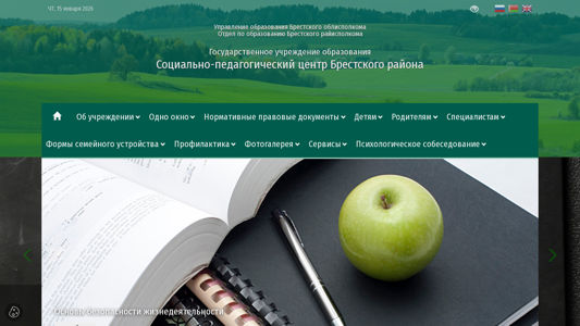 | AI-анализ | The website is a social-pedagogical center for Brest Region, providing information about its location, contacts, and work schedule. The title is "Социально-педагогический центр Брестского района" (Sotsialno-pedahohicny centr Brestskoho rajonu). The description is missing, but based on the top words, it can be inferred that the website offers prevention services and works with minors. The keywords include "социально-педагогический центр" (social-pedagogical center), "центр" (center), "социально-педагогический" (social-pedagogical), "района" (region), "брестского" (Brest), "работа" (work), "график" (schedule), "безопасность" (s |