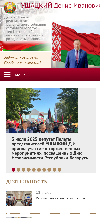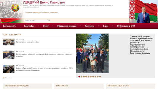 | AI-анализ | The website is the official site of Deputy Denis Ushatsky of the Eighth Convocation of the National Assembly of the Republic of Belarus. It provides information on his legislative, international, and community activities, as well as his biography and contact details. The site includes sections on his district, public appeals from citizens, and media publications. Deputy Ushatsky has been featured in various events, including the Day of Independence, agricultural visits, and children's activities. He has also participated in military-sports events and dialogues with students. The site is available at ushatskiy.house.gov.by. |