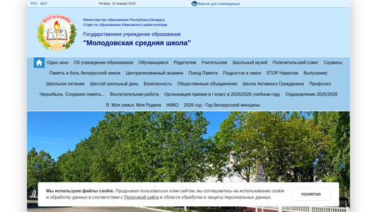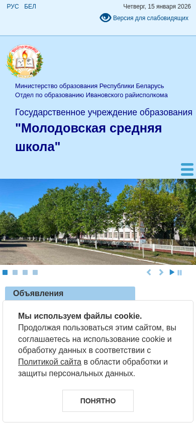 | AI-анализ | This online resource is a website for Mолодовская средняя школа Ивановского района, or Mолодовskaya secondary school of Ivanovsky district, in Belarus. The website contains information about the school, including its name, location, and use of cookies. The most frequent words on the site include "school," "year," "class," "help," and "Belarus." The title of the site is "Молодовская средняя школа Ивановского района" and its domain is molod.ivanovo.edu.by. |