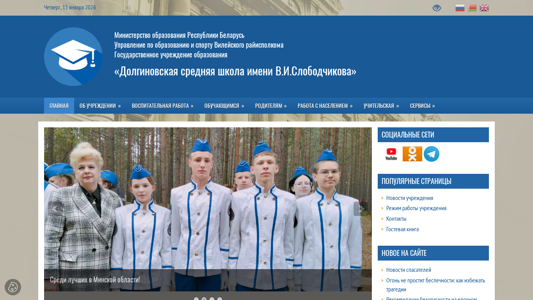 | AI-анализ | This website belongs to the State Educational Institution "Dolginovskaya Middle School named after V.I. Slobdchikov" in the Ministry of Education of the Republic of Belarus, under the management of the Vileyka District Executive Committee. The website provides information about the school, including its history, traditions, achievements, administration, pedagogical staff, and interactive map. It also offers recommendations for using state symbols in educational institutions, paid services, and information on various educational programs and initiatives such as the "Year of Belarusian Women," the "Shag" program, and the "My Family. My Homeland" project. Additionally, the website includes sections on military-patriotic education, social-pedagogical and psychological services, health and safety, and volunteer work. The website also provides information on the admission process for the 2025/2026 academic |