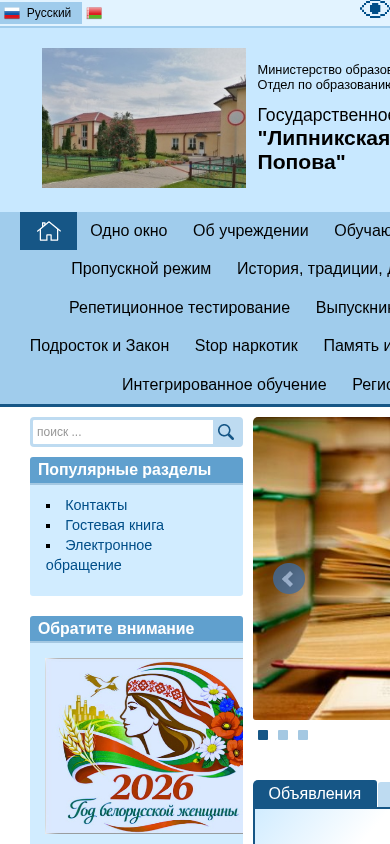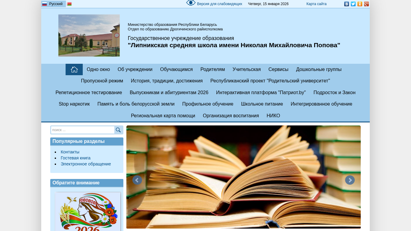 | AI-анализ | --- This online resource is the official website of Lipnikskaia SSh im. N.M.Popova, a secondary school in Drogichin, Belarus. The title of the website reflects its name and dedication to Nikolai Mikhailovich Popov. The description section includes keywords related to education, size, color scheme, and imagery, as well as mentions of the Ministry of Education, school services, and student profiles. The top words indicate that there are sections for parents, teacher services, doshkolnye gruppy (preschool groups), a pass registration system, and information about the school's history, traditions, achievements, and regional support. Additionally, there are sections for student testing, interactive platforms, school meals, integrated education, and organization of education. The website also features a map of assistance and a profile for NIKO. Popular sections include contacts, |