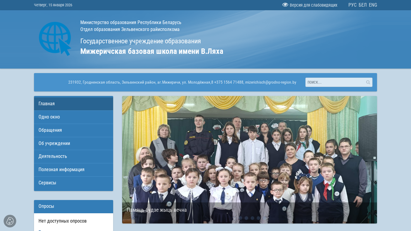 | AI-анализ | The portal "Mizerychskaia baseskola imeni V.Liaha" is a Belarusian educational institution website, providing information about the school named after V. Liaha in the village of Mizerychi, Zhelvan District, Grodno Region. The website includes news and announcements about school events, such as a safety day event for students with traffic inspectors, winter cleaning activities, and an event in honor of Heroes of Afghanistan. The site also features information about the school's programs, including the "Our Children" action and the "School of an Active Citizen." The domain is managed by the Zhelvan District education department and can be contacted via email at mizerichisch@grodno-region.by. |