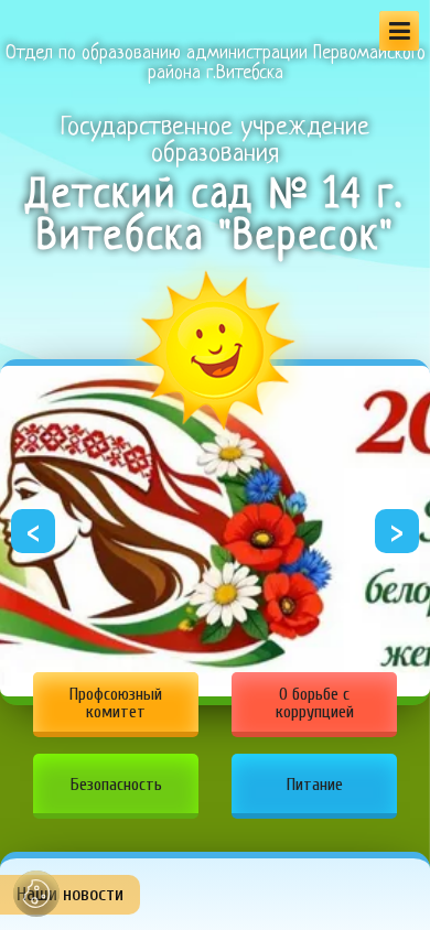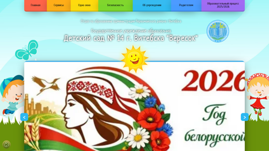 | AI-анализ | The website is a government educational institution for preschool children located in the city of Vitebsk, Belarus, specifically in the district of Pervoo-Vitebsk. The institution is named "Детский сад № 14 г. Витебска "Вересок" (Children's Garden No. 14 of the city of Vitebsk "Vereyk"). The site provides information on various services, including registration, news, a guestbook, and results of surveys. It also features a map of kindergartens in the Vitsebsk region and an educational network in the Pervoi Maya district of the city. Security agencies such as the Ministry of Internal Affairs and the Emergency Situations Ministry provide information on safety and security. The website outlines the institution's policies on handling personal data and combating corruption. Additionally, there are sections for |