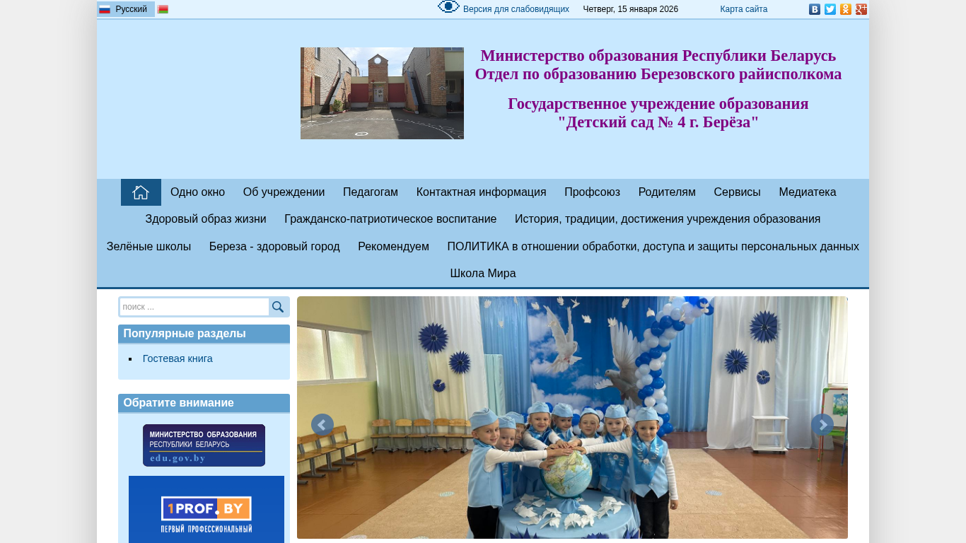 | AI-анализ | --- This online resource belongs to the state educational institution "Detskiy sad № 4 g. Bereza" (Preschool № 4 in Bereza city) in Belarus. The website provides information about the kindergarten, its mission, services, contacts, and educational programs. Keywords associated with the site include 'education', '2025', '2026', 'information', 'news', 'works', 'child', 'garden', 'contact', 'healthy', 'preschool', 'counsel', '2023', 'school', and 'city'. The site includes sections on the kindergarten's history, traditions, and achievements, as well as information on green schools and a healthy lifestyle. Users can find contact information, pedagogical information, and services related to the kindergarten. The site also features a media library and recommendations for political |