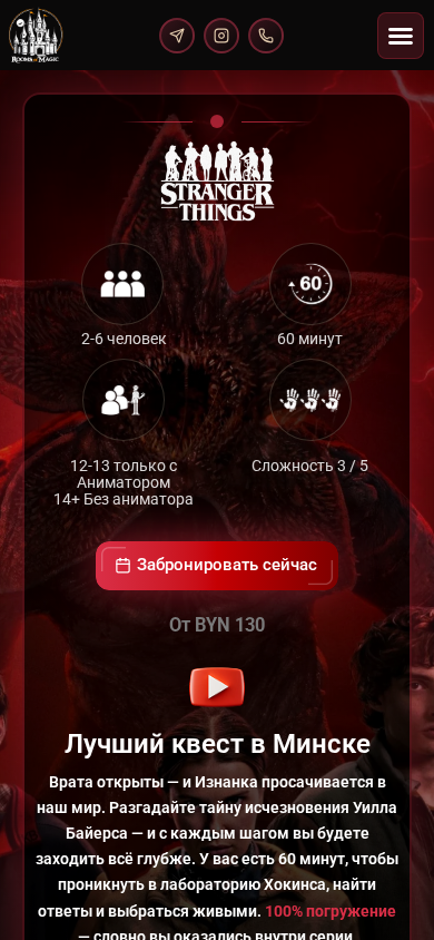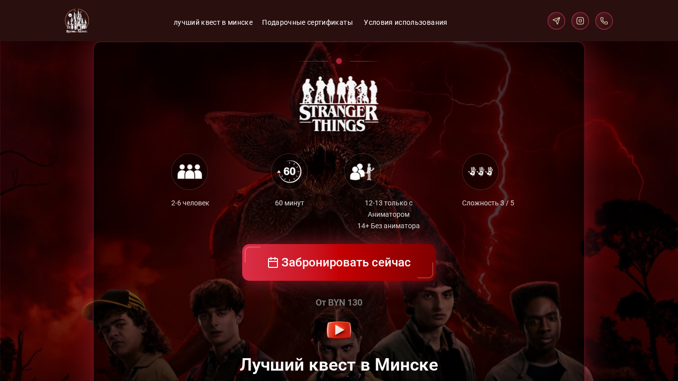 | SEO-описание | Лучший квест в Минске, прямо из вашего любимого сериала Netflix. Победите зло Hawkins Lab, раскройте тайны Невермора и остановите Джека Потрошителя. |
