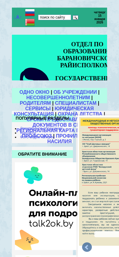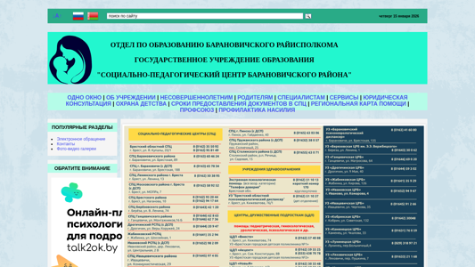 | AI-анализ | The website is the official homepage of the "Social-Pedagogical Center of Baranovichi Region" (SPC), an educational institution under the jurisdiction of the Baranovichi Regional Executive Committee in Belarus. The title of the website is "© СПЦ Барановичского района". The description includes information about the change of font size and instructions on how to do it using keyboard shortcuts. The website was last updated on Thursday, 15th January 2026. The main topics covered on the website are the center's mission, services for minors, information for parents, resources for specialists, and various announcements and news. The website also provides contact information, a photo-video gallery, and a link to a regional map of assistance. The website is compatible with modern browsers and offers a safe browsing experience. The center offers a range of services, |