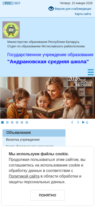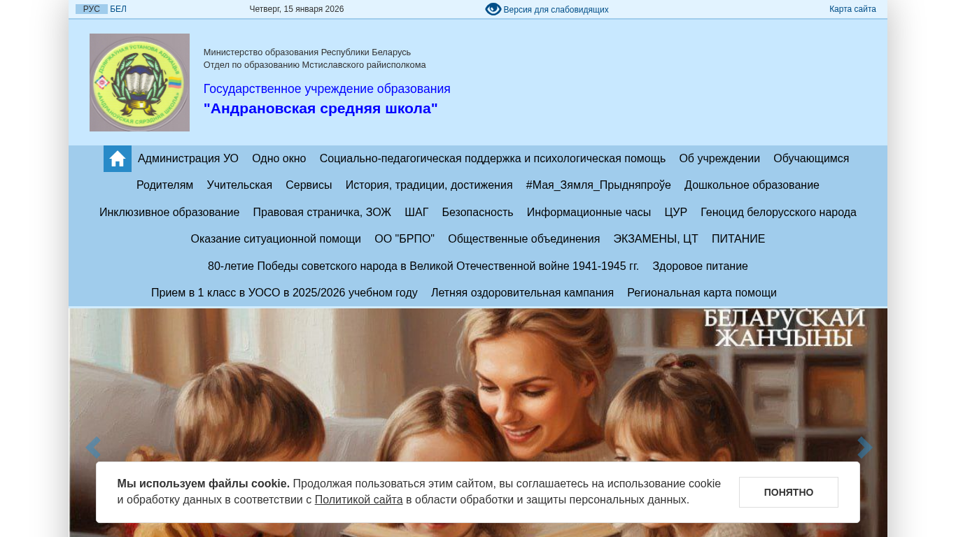 | AI-анализ | --- This website belongs to Andrany Middle School, an educational institution located in Mstislavl, Belarus. The main content of the site includes information about the school, its rules, safety regulations, and schedules for the academic year 2025-2026. Visitors can also find details about administrative procedures, contact information for the school and local government bodies, and various forms and applications. Popular topics include social-pedagogical support, school policies, and educational standards. The site also features sections on student life, such as cafeteria menus, school holidays, and counseling services. Overall, Andrany Middle School's website provides a comprehensive resource for students, parents, and community members seeking information about the educational institution. |