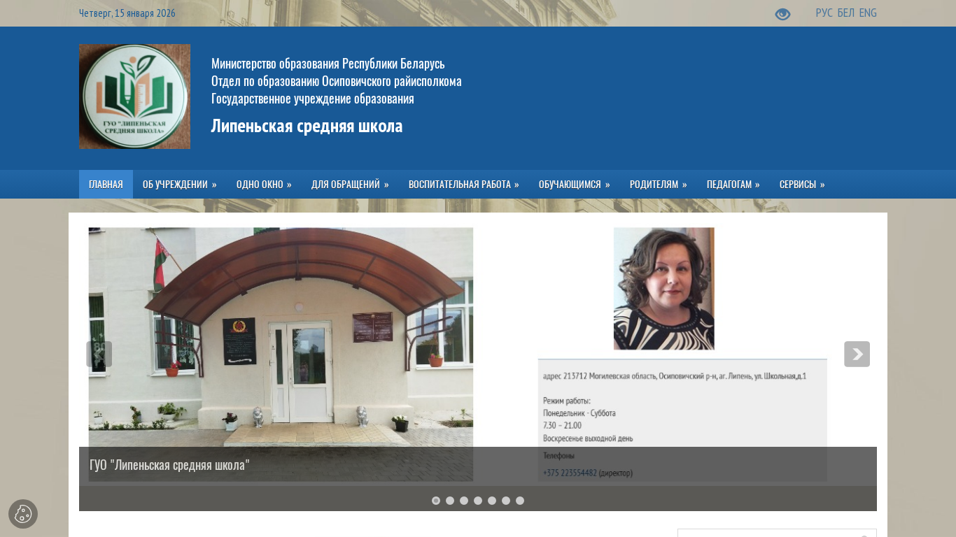 | AI-анализ | The portal Lipen.osipovichiedu.gov.by is the official website of Lipenskaya Srednya Shkola (Lipen Middle School) in Osipovichy, Belarus. The website is operated by the Ministry of Education of the Republic of Belarus and the Osiopovichy Regional Executive Committee. The school provides education to students from various organizations and the community, with a focus on organizing and implementing educational programs. The website includes information on the history, traditions, and achievements of the school, as well as updates on news and events. Users can find information on enrollment, fees for certain services, and contact details for the school administration and other departments. The website also features an informational-analytical section with materials from the General Prosecutor's Office on the investigation of a criminal case regarding the genocide of the Belarusian people |
