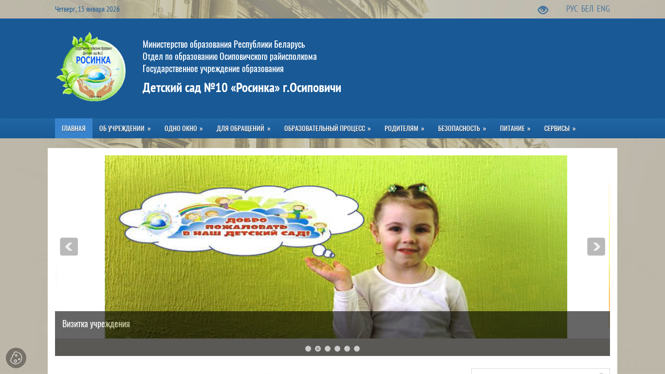 | AI-анализ | The portal is for the Kindergarten No.10 'Rosinka' in Osipovichi, Belarus. It provides information about the kindergarten, including its location, licensing details, operating hours, tasks and functions, structure, leadership, pedagogical staff, news, and available spots for enrollment. The website is managed by the Ministry of Education of the Republic of Belarus and the Osipovichi Regional Executive Committee. It includes sections for the institution's history, traditions, achievements, consultation desk, photo gallery, and union organization. Users can find information about the institution's higher-level organizations, as well as contact information, bank details, and policies regarding the handling of personal data. The website also offers an electronic application process, a FAQ section, and links to various normative legal acts regulating administrative procedures. The educational process is covered, along with information on methodological |