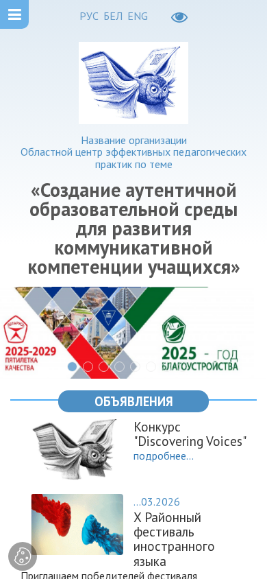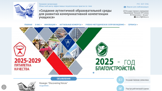 | AI-анализ | The website is for the Regional Center of Effective Pedagogical Practices in Grodno, Belarus. The title is "Областной центр эффективных педагогических практик" and it focuses on the theme "Creation of an authentic educational environment for the development of communicative competence in students". The center is a part of Gimnaziya №9 named after F.P.Kirichenko in Grodno and their email is esl.rc9@inbox.ru. The website provides information about the center's goals and tasks, a consultation desk, news and events, interactive modules like GLOGSTER EDU, current contests such as the "Discovering Voices" regional distant contest and the city's language festival, methods of teaching, preparation for exams, and research activities. The website also features a map of the |