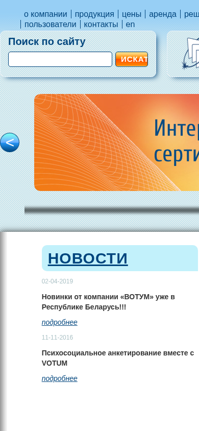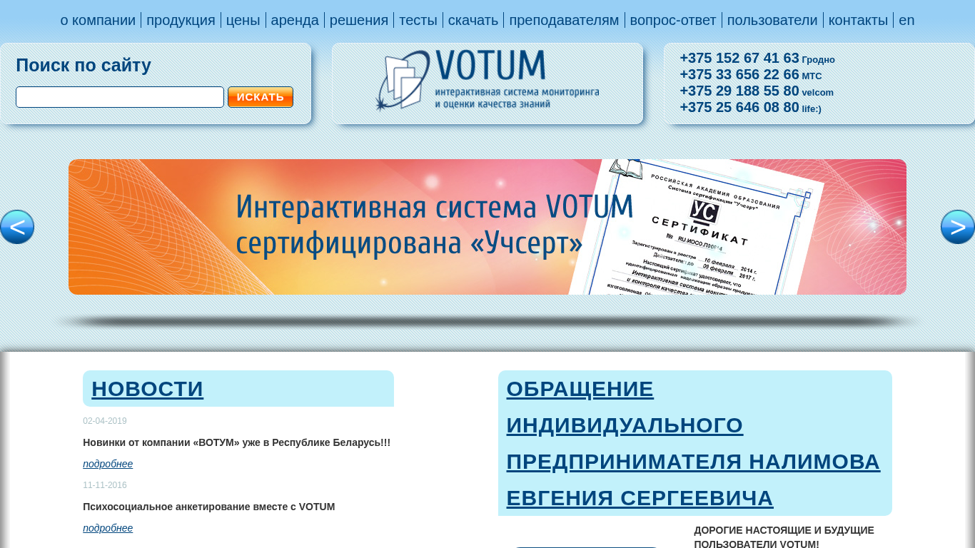 | SEO-описание | VOTUM — это неотъемлемая часть единой информационно-образовательной среды школы. Это мобильная инструментальная система для формирования интерактивной среды обучения. VOTUM полезен учителю, который организуют эффективное обучение, использует инновационное оборудование, сотрудничает с обучающимися, превращает урок в искусство и знает, как увлечь в обучении с удовольствием! Позволяет реализовать инновационные технологии: в ходе учебной деятельности; во внеклассной работе; в общественно-государственном управлении образовательной организации. Компания «Вотум-Беларусь» предлагает в аренду интерактивную систему голосования VOTUM для получения оперативного среза общественного мнения, проведения различного рода опросов и голосований в ходе презентаций, конгрессов, конференций, семинаров, форумов, съездов, симпозиумов, тренингов, а также шоу и других развлекательных мероприятий. Оперативно обрабатывает и отображает полученные объективные результаты по любой теме и отдельному вопросу, как в числовом, так и графическом |