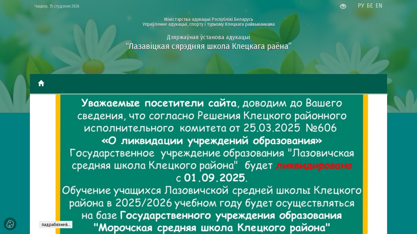 | Адрес | цкая сярэдняя школа Клецкага раёна”, 2026, адрас: 222645, Мінская вобласць, Клецкі раён, аг. Лазавічы, вул. Перамогі, 1 |
