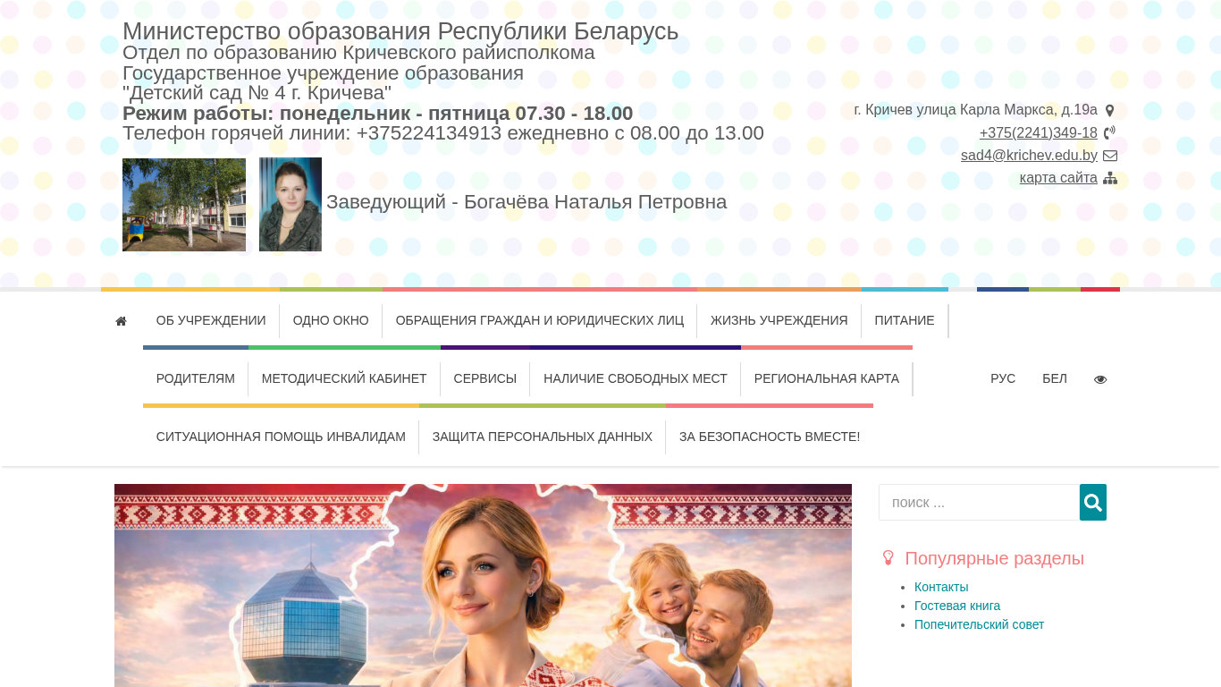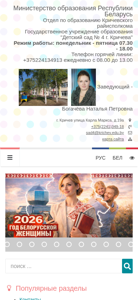 | AI-анализ | This online resource is for the "Detsky sad #4 g. Krichev" Kindergarten, which is a state educational institution under the Ministry of Education of the Republic of Belarus, Krichev District Education Committee. The kindergarten's website provides information about its structure, conditions for admission, pedagogical staff, legal basis, history, achievements, and contacts. The kindergarten operates Monday to Friday from 07:30 to 18:00. Visitors can contact the kindergarten by phone at +375224134913 or email sad4@krichev.edu.by. The website includes a map and sections on the kindergarten's organization, pedagogical team, legal foundation, history, and accomplishments. Visitors can also find information on various aspects of the kindergarten's activities, |