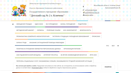 | AI-анализ | This online resource is the official website for the state educational institution "Detsky Sad No. 2 g. Klicheva" located in Klichev, Mogilev Oblast, Belarus. The title of the website is "Детский сад 2 г. Кличева" (Children's Garden No. 2 g. Klicheva). The description section of the website includes information about the use of cookies, the Ministry of Education of the Republic of Belarus, Klichev Regional Executive Committee, the Kliчевsky District Educational Administration, the location and contact details of the institution, a site map, sections for handling citizen inquiries, work schedules for the institution's leadership, and various other administrative and educational-related information. Keywords associated with the website include "education," "institutions," "preschool," "details," "rep |