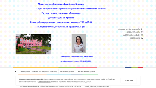 | AI-анализ | The portal "Детский сад № 2 г. Кричева" is an educational institution website. It provides information about the kindergarten, including its location, contact details, operational hours, and various documents related to the organization. The site uses cookies and has a map of the site, as well as sections for citizen inquiries, schedules for personal meetings, and popular inquiries. There are sections for higher-level organizations, a virtual tour, and information about admission and the educational staff. The site also includes sections for various documents, a history of the institution, and details about its licensing and functions. Additionally, there are sections for health and safety, energy conservation, and a parent council, among others. The site has a rating evaluation and a section for humanitarian cooperation, as well as important documents, news, and a contact form. The domain is sad2.krichev.edu |