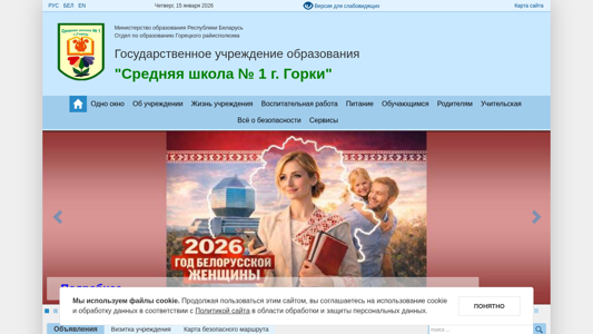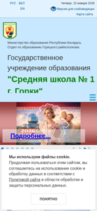 | AI-анализ | This online resource is the official website for Middle School No. 1 in the city of Gorki, Belarus. The title of the website is "Средняя школа № 1 г. Горки" (Middle School No. 1 in the city of Gorki). The description is predominantly in Russian, with some terms appearing frequently, such as "горки" (Gorki), "школа" (school), and "учителей" (teachers). The most common keywords include "далее" (further), "умо" (mind), "организации" (organizations), "новости" (news), and "режим" (regime). The website likely contains information about the school, its faculty, academic programs, and possibly news or events. It may also provide resources or services for students, parents, or the community |