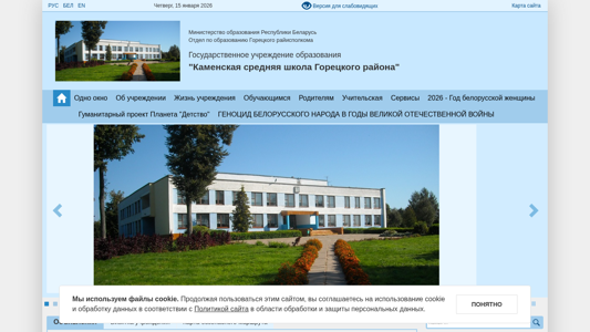 | AI-анализ | The website <каменская средняя школа Горецкого района> is a school located in the Goretsky region of Belarus, as indicated by the title and domain name. The description is in Belarusian, but based on the top keywords and words, it can be inferred that the website is about a secondary school in the town of Каменская. Some of the top keywords include 'школа' (school), 'средняя' (secondary), 'горецкого' (Goretsky region), 'района' (region), and 'образования' (education). Other words that appear frequently include 'далее' (further), 'читать' (read), 'режим' (schedule), 'приема' (admission), and 'карта' (map). The domain name, kam.gorki.edu |