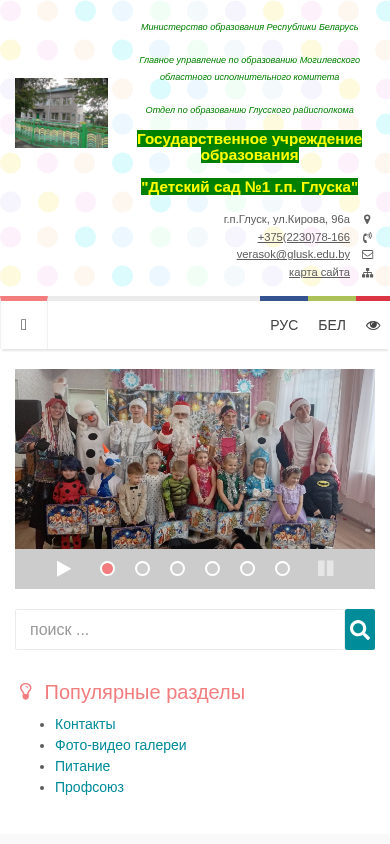 | Адрес | Глусского райисполкома, Государственное учреждение образования, "Детский сад №1 г.п. Глуска", г.п.Глуск, ул. Кирова, 96а |