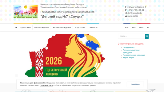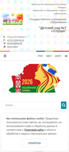 | AI-анализ | The web project "Детский сад №7 г.Слуцка" (Children's School No. 7 in the city of Slutsk) is a website belonging to a state educational institution under the Ministry of Education of the Republic of Belarus. The site provides information about the kindergarten located at ul.Korzuna 4 in Slutsk city. The homepage includes sections on the kindergarten's structure, working hours, administrative procedures, and contact information, as well as a map of the location. The kindergarten offers educational services and has various groups for children from 2 to 7 years old. The site also includes sections on the administrative body, staff, and the kindergarten's achievements. Visitors can find information on the normal operating hours of the administration office and the procedures for meeting with citizens. The site also includes links to key regulatory documents, such |