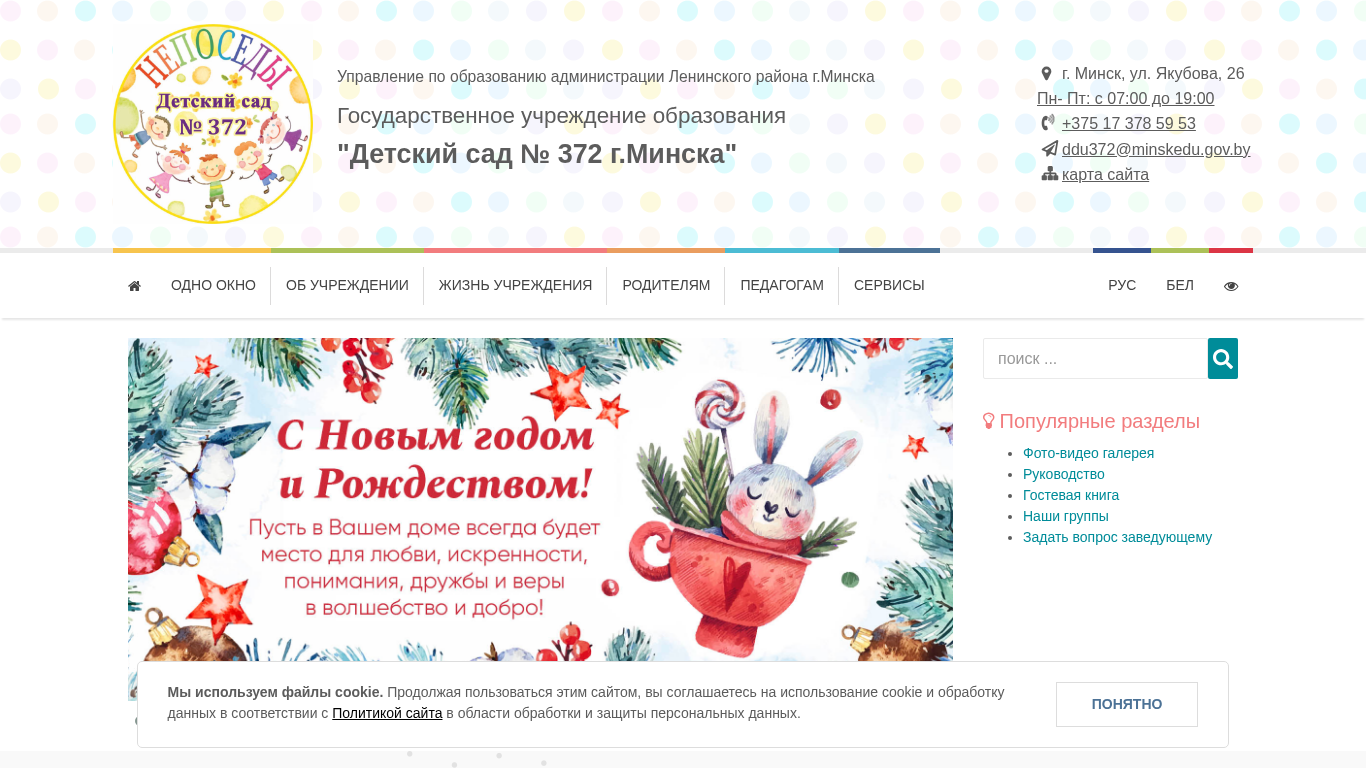 | Адрес | Ленинского района г. Минска, Государственное учреждение образования, "Детский сад № 372 г. Минска", г. Минск, ул. Якубова, 26 |