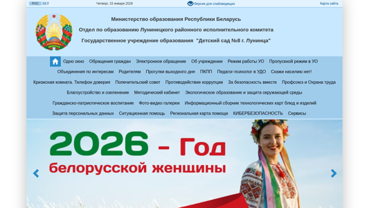 | AI-анализ | The web project "Ясли-сад №8 г. Лунинца" (Kindergarten No.8 of Luhansk) is a website belonging to a state educational institution in Belarus. The title and description suggest that it is a kindergarten, and the keywords and top_words confirm this. The website contains information about administrative procedures, contacts, and the schedule for receiving citizens at the education office. It also includes information about the management, pedagogical team, and licensing of the kindergarten. Additionally, there are sections on the history, traditions, and achievements of the kindergarten, as well as recommendations from the head of physical education, music leader, and preschool education provider. The website provides information on extracurricular activities, consultations for parents, and anti-corruption measures. It also includes sections on safety, crisis management, and labor protection. The website is operated |