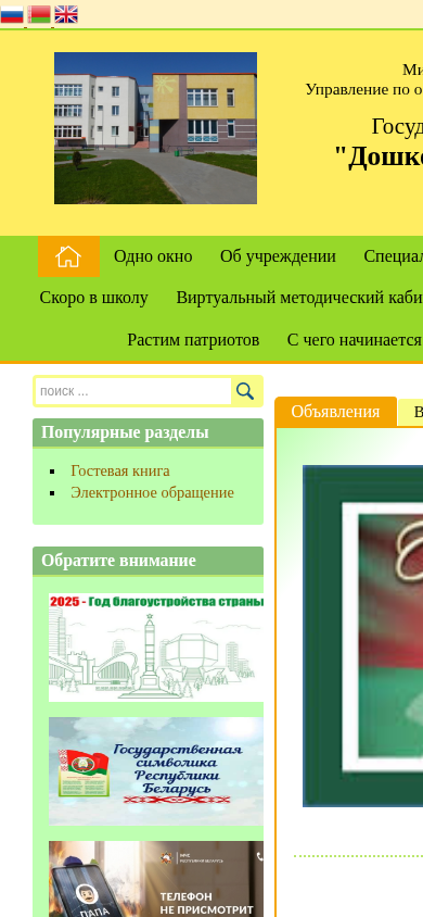 | AI-анализ | The portal "ДЦРР Солнышко г.Слуцка" (State Educational Institution "Preschool Center for Child Development 'Solnyshko' in the city of Slutsk") is dedicated to the organization and administration of a preschool educational institution. Key topics include early childhood education, schedule and admissions, administrative procedures, and electronic applications for services. The site includes sections for contact information, policy on personal data, and vacancies. The institution offers various groups for children with different interests and educational profiles. Additional educational services are available for free and on a fee-basis. The site features a virtual tour, information on the institution's achievements, and a union for parents. The domain is solnyshko.slutsk.edu.by. |