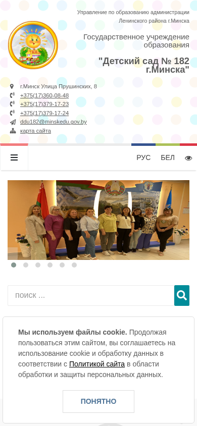 | AI-анализ | language: ru The web project "Детский сад 182 г.Минска" (Children's Kindergarten No. 182 in Minsk) is a government educational institution located in Minsk, Belarus, specifically at Ulitsa Prushynskikh, 8. The website provides information about the kindergarten, including its administration, structure, working hours, contacts, and various administrative procedures. The key focus of the website is on the kindergarten's educational mission and offerings. Visitors can find details about the kindergarten's leadership, the educational approach, and the various support services available, such as psychological assistance and corrective pedagogical help. The website also features a virtual tour, information about the history and traditions of the kindergarten, and resources for parents, such as a FAQ section and an interactive map. Additionally |