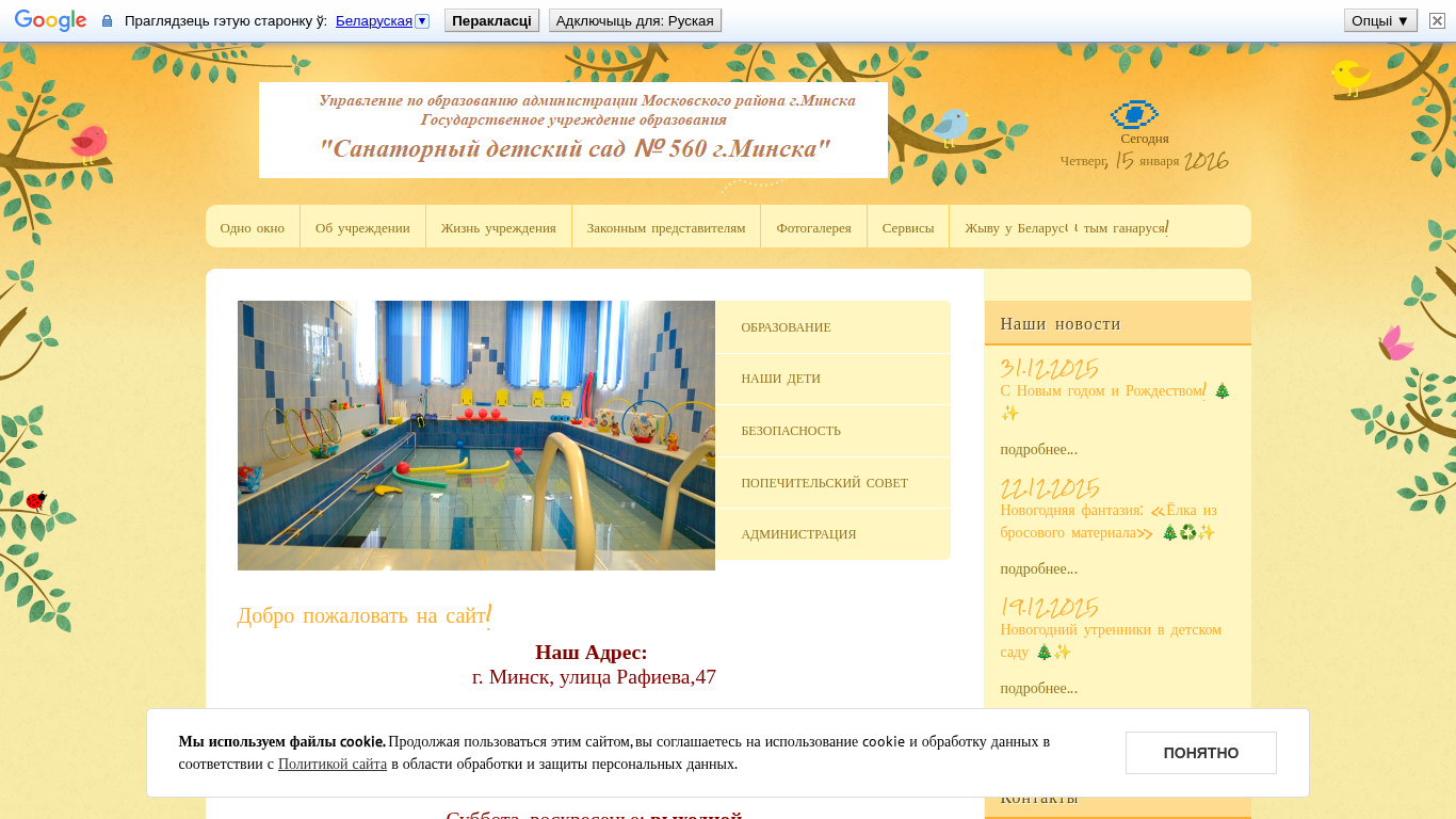 | AI-анализ | This online resource is a website for a kindergarten with the title "Дошкольное учреждение № 560" (Kindergarten No. 560) and welcomes visitors with the phrase "Добро пожаловать!" (Welcome!). The site uses cookies and requires agreement with its Privacy Policy before further access. The current date is Thursday, 15th January 2026. The website provides information on the administration's working hours, reception of citizens, administrative procedures, and electronic services. It also offers electronic application forms, situational assistance for disabled individuals, popular requests, and contact information. The website structure includes sections on the organization, goals, and functions of the administration, as well as conditions for admission, important documents, and Belarusian state symbols. Additional features include an assessment portal, informational work, life at the kind |