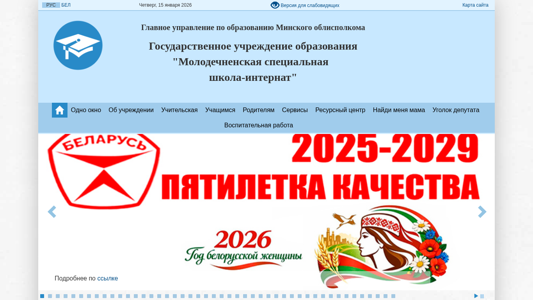 | AI-анализ | This website belongs to the Minsk Oblast Education Administration and is dedicated to the "Molodechnenskaia specialnaia shkola-internat," or Molodechno Special School-Internat. The title and description keywords indicate that this is a special educational institution, likely for students with disabilities or other special needs. The top_words suggest that the school offers a range of educational and administrative services, including a methodological union for teachers and a rating evaluation portal. The website includes information on contacts, schedules for citizen visits, administrative procedures, and various policies and documents. The structure of the website includes sections on the administration, goals and tasks, faculty, and various educational and support programs. The website is available in both Russian and Belarusian languages. |