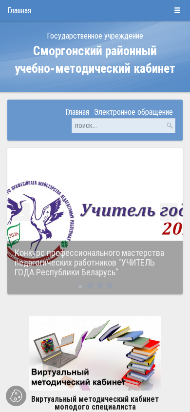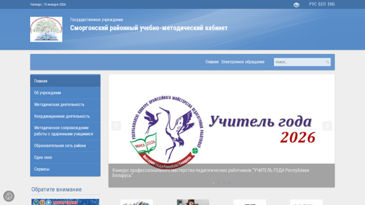 | AI-анализ | --- The web project "Сморгонский районный учебно-методический кабинет" (smorgon-edu.gov.by) is a government educational institution's website. It features information about various educational events, including the "Учитель Года Республики Беларусь" (Teacher of the Year) competition, an August meeting for leading and pedagogical staff, and a virtual methodological cabinet for young specialists. The website also provides access to educational resources such as "Дошколенок" (Preschooler), an educational resource, and "Все грани мастерства" (All Sides of Mastery), a pedagogical skills development school. Additionally, there is a competition for pedagogical ideas called "Интерактивный мир знаний" (Interactive World of Knowledge), and a section dedicated to celebr |