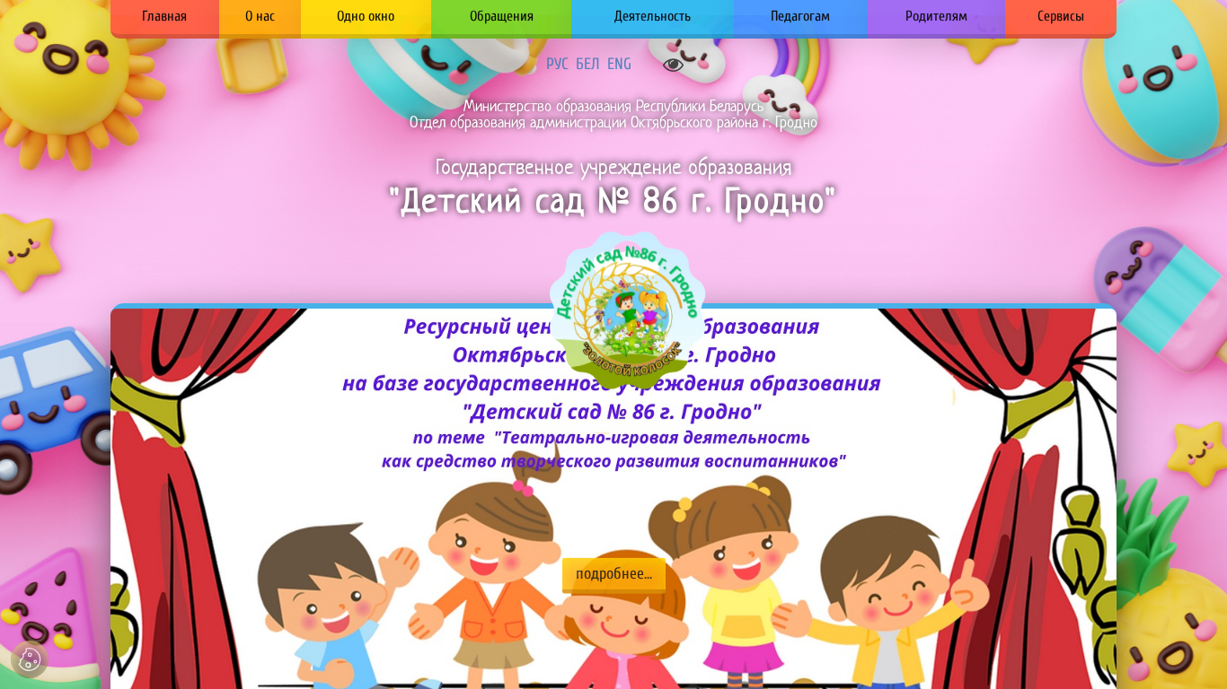 | AI-анализ | The portal udo86.oktobrgrodno.gov.by is a website dedicated to the Kindergarten No. 86 in Grodno, Belarus. The main topics of the site include information about the kindergarten, its management, structure, history, and regulations. Keywords associated with the site include 'grodno', 'education', '2026', 'news', 'children', and 'kindergarten'. The site provides details about the kindergarten's leadership, organizational structure, history, and traditions. It also includes information about the kindergarten's working hours, contacts, and special permissions. Additionally, the site offers resources for safe childhood, patriotic education, and teacher information for parents. The site is operated by the Republic of Belarus Ministry of Education and is part of the Octyabrsky district administration in Grodno |