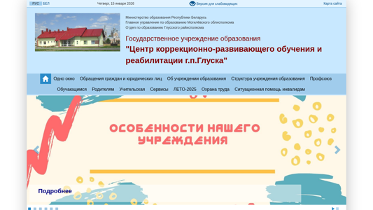 | AI-анализ | --- The website 'ЦКРОиР г.п.Глуска' (ckro.glusk.edu.by) is the official site of the State Educational Institution "Centre for Correctional and Developmental Education and Rehabilitation" in the city of Glusk, Belarus. The site provides information on the organization, its structure, educational programs, and services. Key topics include normative documents, administrative procedures, contacts, and schedules. The website is predominantly text-based with a few images. The color scheme is standard, and text size and line spacing are set to medium. The site is divided into sections, including information on the educational process, social-pedagogical support, and emergency psychological assistance. The main audience appears to be parents, educators, and local government bodies. The site also offers an electronic application system and a FAQ section. The domain is managed |