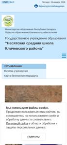 | AI-анализ | The website is for the "Nesyatskaya Srednya Shkola Klichevskogo Rayona" or Nesyatsk Secondary School of Klichevsky District in Belarus. The title and description are in Belarusian. The website uses cookies and informs users about its privacy policy. The school is an educational institution under the Ministry of Education of the Republic of Belarus and Klichevsky District Executive Committee. The website provides information on the school's administration, contact details, popular requests, and electronic application submissions. It also features sections on the school's history, facilities, and services for students, such as a library, social support, and cafeteria. Additionally, there are sections for parents, including rules, faculty, and a parent university. The website seems to have a focus on providing various social services and support for students and their families in |