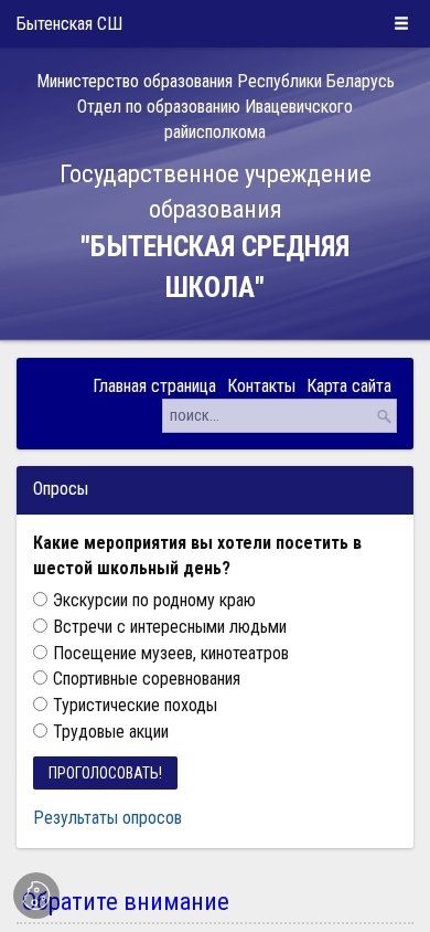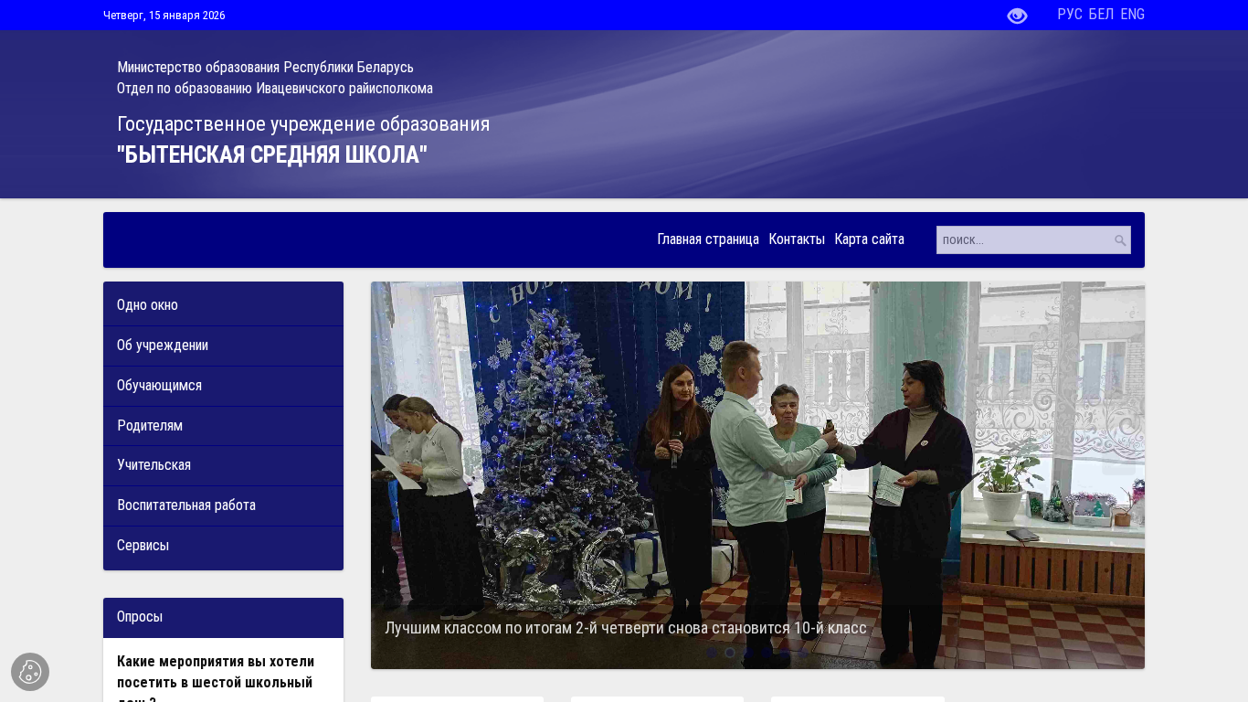| Адрес | БЫТЕНСКАЯ СРЕДНЯЯ ШКОЛА, ВЕБ-МАСТЕРСКАЯ.БЕЛ, 225281, Брестская область, Ивацевичский район, аг. Бытень, ул. Комсомольская, 4 |