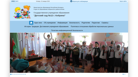 | AI-анализ | This website belongs to the state educational institution "Children's Garden No. 12" located in the city of Kobrin, Belarus. The title and description indicate that it is a kindergarten. The keywords include words related to education, reading, size, 2025 and 2026, institutions, and addresses. The top words suggest that the site contains information about the ministry of education, administrative procedures, popular requests, and contacts. The site is in Belarusian and has a standard color scheme with black and white images. It provides information about the kindergarten's schedule, leadership, and educational services, as well as policies on personal data and safety. The site also includes a map, RSS feed, and links to various authorities and contacts. The kindergarten offers additional educational services, has a parent council, and provides information about health, nutrition, and safety. The |