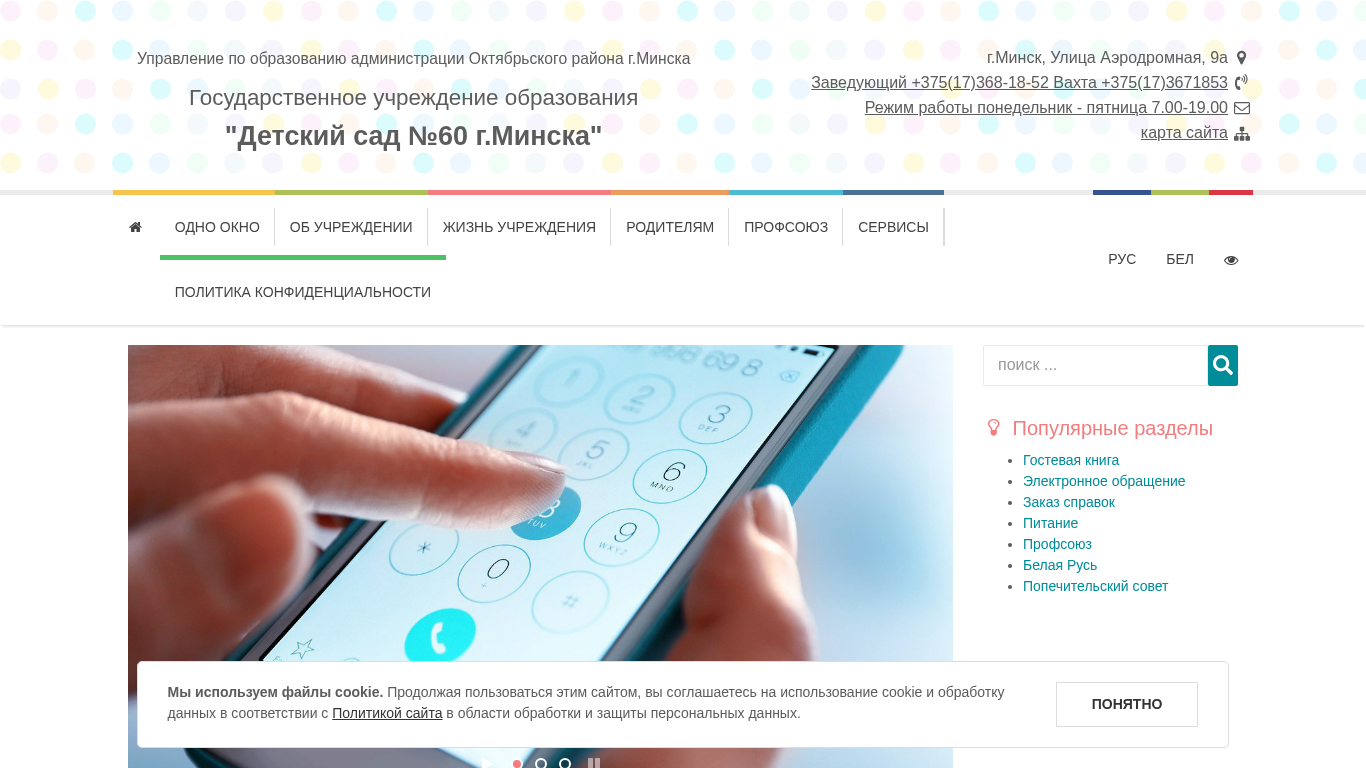 | Адрес | Октябрьского района г. Минска, Государственное учреждение образования, "Детский сад №60 г. Минска", г. Минск, Улица Аэродромная, 9а |