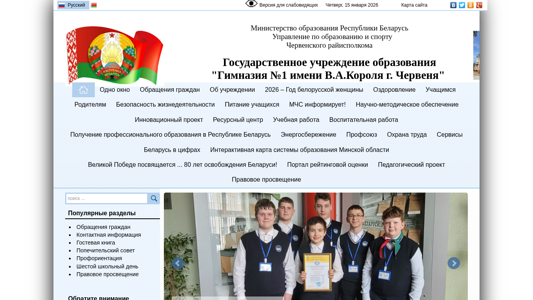 | AI-анализ | The website is a school website for Cherven High School No. 1 named after V.A. Korolev located in the city of Cherven, Belarus. The website contains information about the school, its educational programs, student life, and various initiatives, including a project for the Year of the Belarusian Woman in 2026, a health and safety section, and a section for obtaining professional education in Belarus. The website also features a news section, a contact page, and a section for parents. The design is standard with a gray color scheme and standard font size. The website does not have images enabled, and the text is displayed in black and white. The website includes a map of the education system in the Minsk region and a link to the Ministry of Education in Belarus. Additionally, the website offers a resource center for educational work, a section for student and teacher services, and |