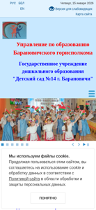 | AI-анализ | The portal ds14.baranovichi.edu.by is a website for a children's daycare center named "Детский сад №14 г.Барановичи" located in Baranovichi, Belarus. The site provides information about the daycare center's schedule, advice, and news. The title of the site is "Children's kindergarten No.14 in Baranovichi" and the top keywords include "children's," "kindergarten," "schedule," "advice," and "Baranovichi." Other frequent words are "read more," "further," "2025," "works," "site," and "safety." The site uses cookies and is available in Belarusian and other languages. The size and spacing of the text, as well as the color scheme, can be customized |