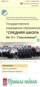 | AI-анализ | --- This online resource belongs to the State Educational Institution "Middle School No. 3" located in the city of Hanevichi, Belarus. The website contains information about the school's schedule, leadership, contacts, and various educational documents. Keywords associated with the site include "school," "education," "schedule," "work," and "Gancevichi." The top words include "reading," "further," "education," "graphic," and "institutions." The site is standard-sized with a neutral color scheme and no images. Additional features include accessibility options, a map of the site, and links to the Ministry of Education in Belarus and the Gancevichi district executive committee. The site provides information on the school's schedule for receiving citizens, the work hours of the administration, and contacts for various organizations and procedures. It also includes a phone directory |