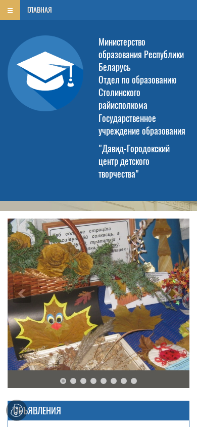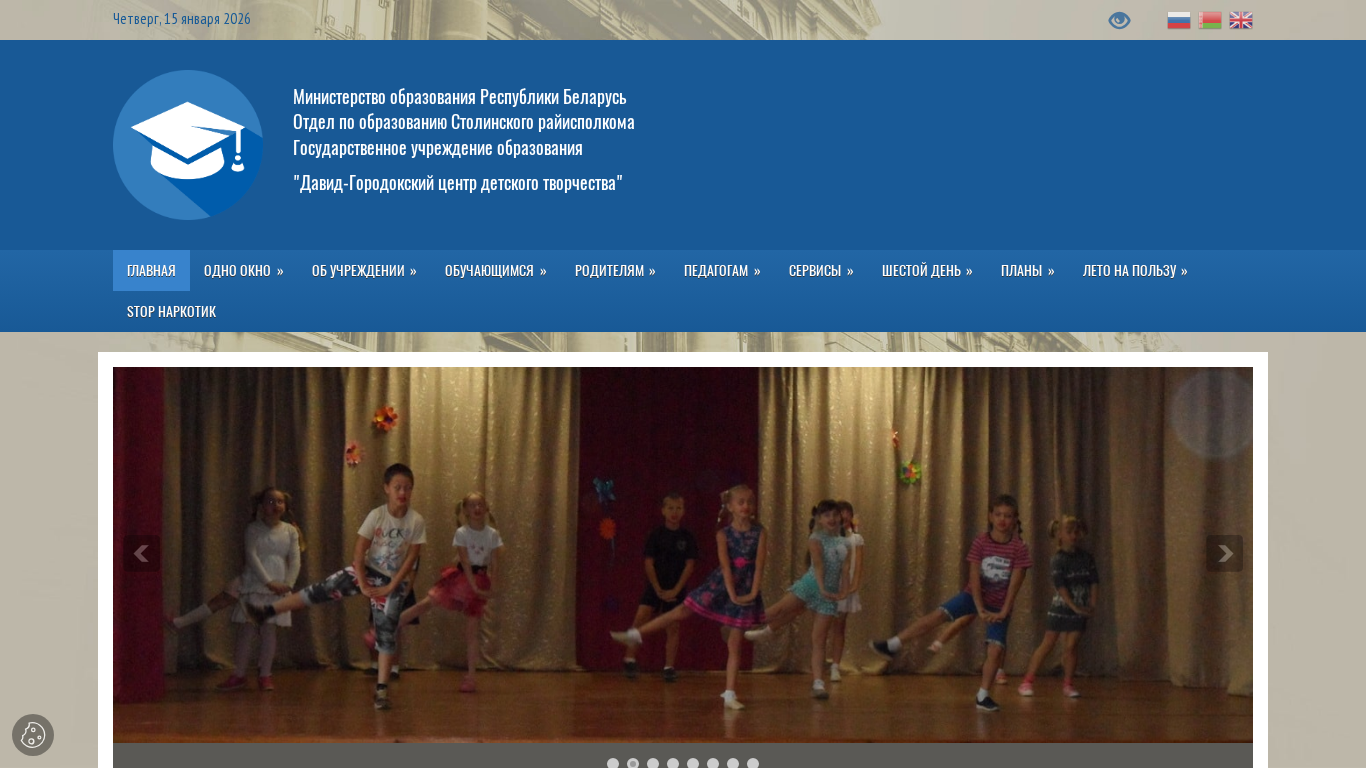 | AI-анализ | The website "Давид-Городокский центр детского творчества" (David-Ghorodok Children's Creative Center) provides information about the center's works, plans, and events for children. The title and description are in Belarusian. Keywords associated with the website include "работы" (works), "план" (plan), "интересам" (interests), "подробнее" (in detail), "календарный" (calendar), "четверть" (quarter), "2026" (year), "каникулы" (summer vacation), "образования" (education), "день" (day), "йская" (January), "контакты" (contacts), "расписание" (schedule), "шестой" |