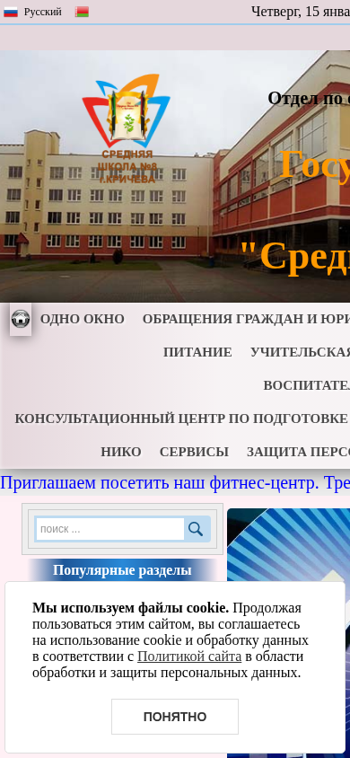 | AI-анализ | The web project "СШ №8 г. Кричева" (School No. 8 g. Krichev) is a government educational institution website located in Belarus. The site contains information about the school, including its address, contact details, and educational offerings. Keywords associated with the site include "education," "school," "Krichev," and "BY." Popular topics on the site include a schedule for citizen interaction, a safety package, a situational assistance section, and various announcements. The site also offers a fitness center with a gym, pool, and sauna, along with contact information for the school director and email address. From December 22, 2025 to January 9, 2026, the site is participating in a regional interagency action called "Поговори с ребеномком" (Talk to the |