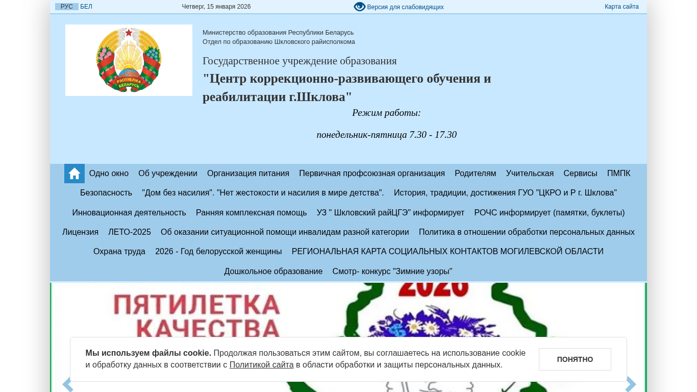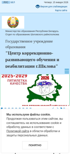 | AI-анализ | The website is the official page of the "Centre of Correctional-Developmental Education and Rehabilitation of Shklov City" in Belarus. It provides information about the educational institution, its administration, work schedule, and contact details. The website uses cookies and requires user agreement to its privacy policy. The content is available in both Russian and Belarusian languages. The institution offers various educational programs, social-psychological services, and a canteen. It also provides consultations from specialists and organizes free vacancies. The website includes sections for documents, news, and a virtual tour. The administrative body, pedagogical staff, and social-psychological service team are introduced. The contact information includes phone numbers and electronic mail for direct communication. The website is operated Monday to Friday from 7:30 to 17:30. |