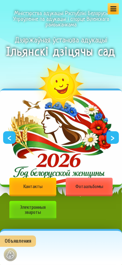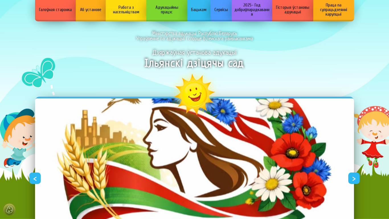 | AI-анализ | The website "Ільянскі дзіцячы сад" (Ilyasad.vileyka-edu.gov.by) is the homepage of an early childhood education institution in Belarus. It provides information about the kindergarten's registration, schedule, administration, and organizational structure. The institution's name, "Ільянскі дзіцячы сад" (Ilyanskie detskie sad), translates to "Ilyan's Children's Garden." The keywords suggest topics related to the kindergarten's tasks for the 2025/2026 academic year, its working hours, the administration's contact information, and various services for parents. The website contains a registration form, an informational brochure for parents, and a contact section with phone numbers and email addresses. The top_words indicate that the website |