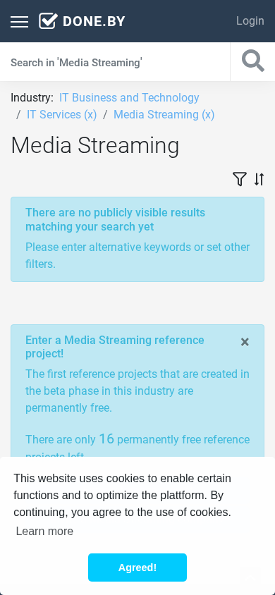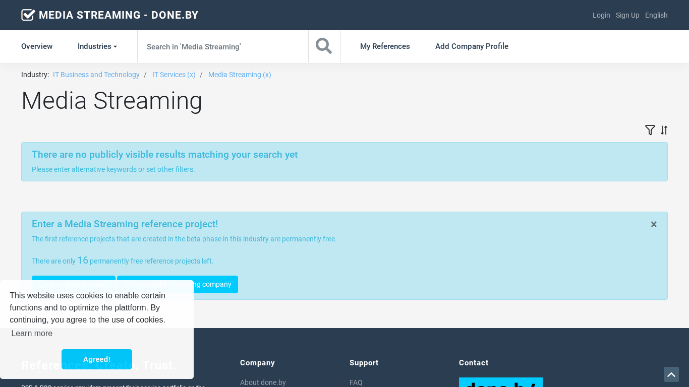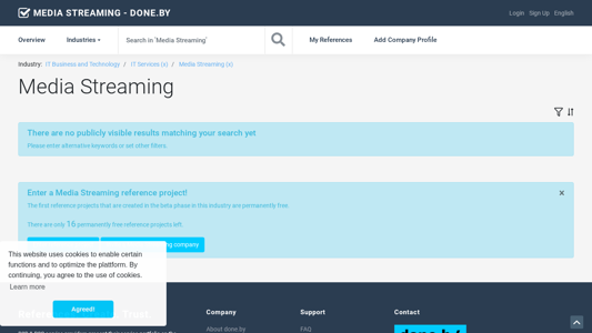 | AI-анализ | This website, media-streaming.done.by, is a B2B platform dedicated to the IT Business and Technology sector, specifically for the Media Streaming industry. Companies in this sector can present their portfolio, including project references and success stories, on the platform. Users can apply filters to search for references based on project period, reference types, company size, and legal forms. The website also provides an overview dashboard and watchlists for communications and industry categories, including Media Streaming. The platform uses cookies and requires users to agree to their use before continuing. The website's language can be switched between English and German. |