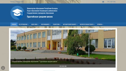 | AI-анализ | --- This website belongs to Gudoгайская средняя школа (Gudogaiskaya Srednyaya Shkola), located in Ostravetsky rayon, Minskaya voblasts, Belarus. The title of the website is "Гудогайская средняя школа" and the description includes information about the end of the 2024/2025 academic year, school news, plans for events, reports on past events, organization of school meals, normative-legal support for school meals, healthy eating, rules of conduct in the school cafeteria, the school's achievements, Olympic movement, history, traditions, and accomplishments, occupational safety, the school's charter, a virtual tour, admissions, school management, pedagogical staff, paid services, library, media center, electronic learning tools, jubilees |