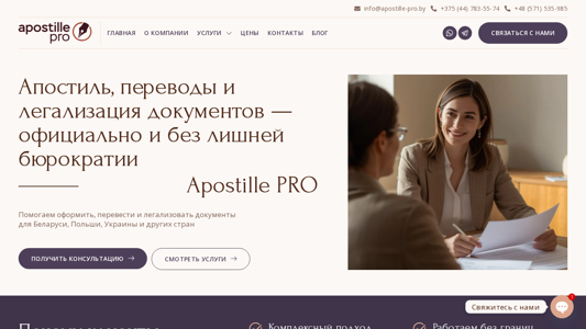| AI-анализ | This website is a document legalization center based in Minsk, Belarus. It offers services for obtaining an apostille, notarial certification, sworn translation, and document delivery in Belarus and abroad. The website emphasizes speed, convenience, and reliability. The website contains information about the company, its services, including apostille in Poland and document services from Ukraine, sworn translation, document acquisition and delivery, prices, and contacts. The company also has a blog. The website is available in Belarusian and Polish languages, and offers contacts in Belarus and Poland for communication. The website is operated by Apostille PRO, which helps to obtain, translate and legalize documents for Belarus, Poland, Ukraine, and other countries. The company provides a comprehensive approach from consultation to the finished document, and operates without borders in Belarus, Poland, Ukraine, and other countries, offering services |
